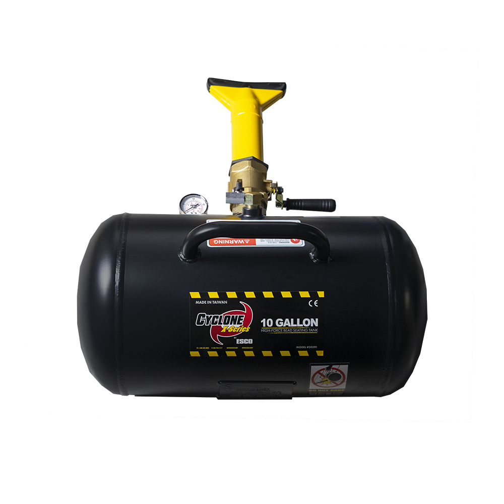 The Cyclone X-Series Bead Seating Tank offers two models for small and medium applications. Both models are equipped with robust air tanks, casted out of steel and ASME certified. The Cyclone X-Series Bead Seaters supply a hassle-free, simple solution to seat the beads on equipment tires ranging from golf carts up to heavy duty and construction application. The Cyclone X-Series 5-gallon Bead Seating Tank (Model #20390) is recommended for small and passenger tire application. The Cyclone X-Series 10-gallon Bead Seating Tank (Model #20391) is recommended for most commercial tire sizes, skid steers and some tractor tires.
