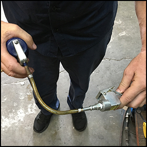 Lubricate the air motor. This can be done by adding your lubrication of choice into the air actuator trigger (just a few drops) before you use the jack each day. (See example below). This will lubricate the air motor piston and cylinder walls for smooth oscillation and it will help keep water off of the metal parts in the air motor which can cause rust.