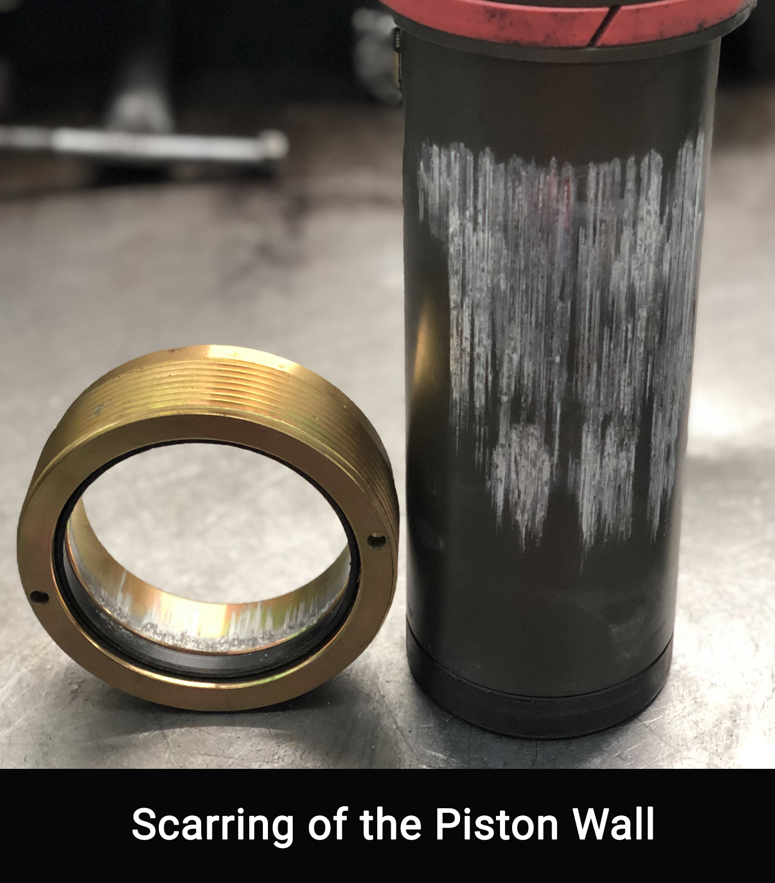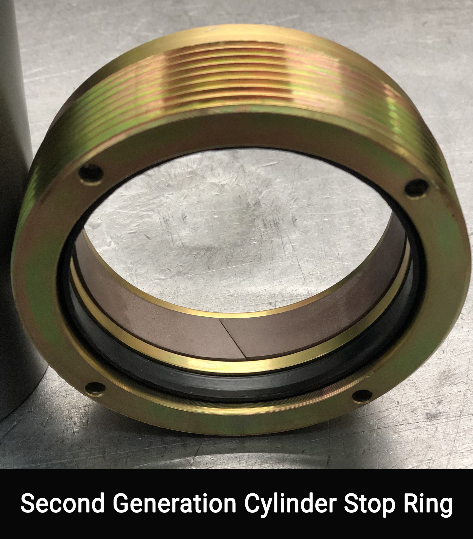 The first-generation cylinder stop ring had a single groove machined for the piston rod wiper. The wiper kept internal contamination to a minimum, as was designed, it also created a slight side to side movement. This movement increased point load situations which, in turn, caused severe scarring on the outside walls of the piston rod as well as the internal walls of the cylinder.