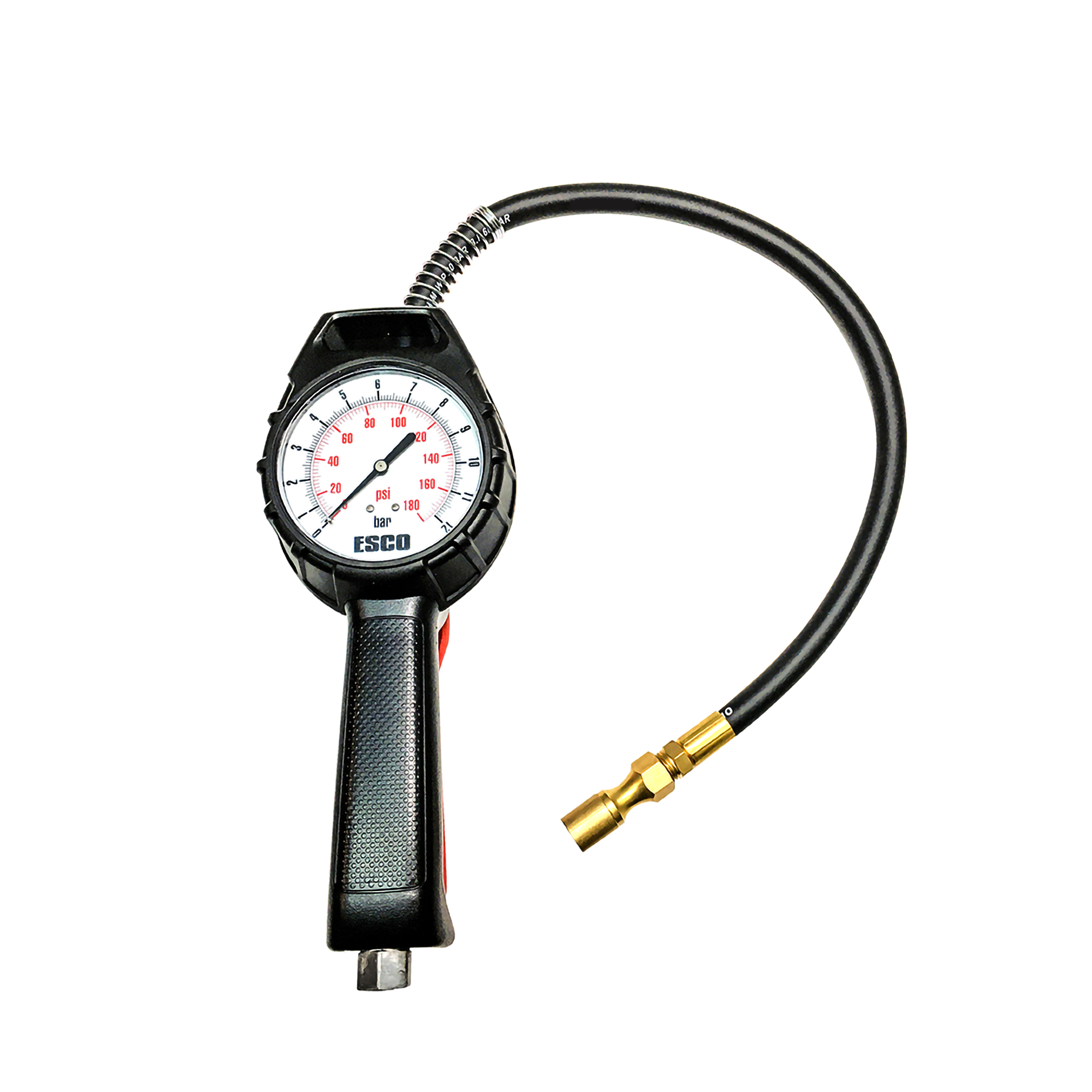 The ESCO Dial Gauge Tire Inflator (Model #10960) is a handheld tire inflation unit designed for professional and hobbyist applications. The easy to read/measure large dial style, that reads both psi and bar, makes it ideal for any tire shop or personal garage. Constructed of a lightweight Aluminum die-cast body covered by a protective rubber sleeve, this unit is designed for maximum protection/strength of the inflation unit as well as comfort for extended use in the shop or at home. With an accuracy rating of +/- 2 psi and a 1-year warranty, this professional inflation unit is perfect for any application.